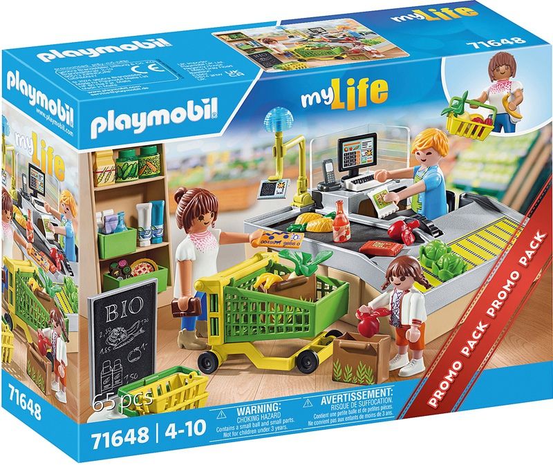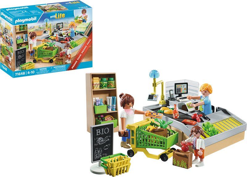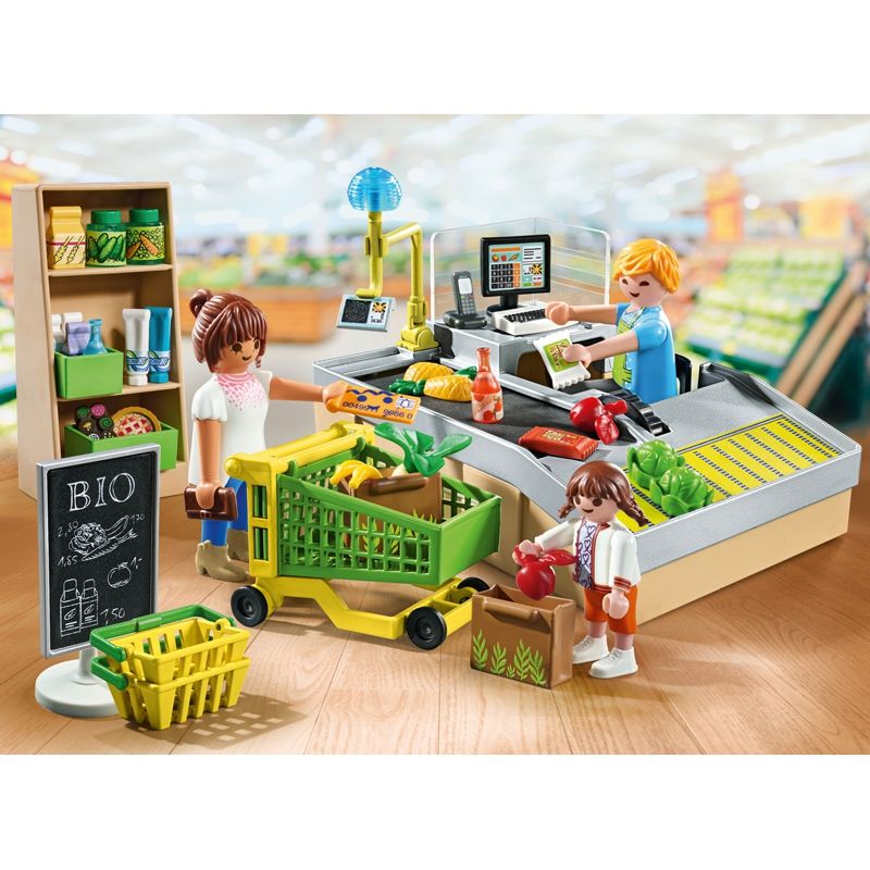 Viens faire tes courses ! Comprend trois personnages, un tapis de caisse enregistreuse et des accessoires.