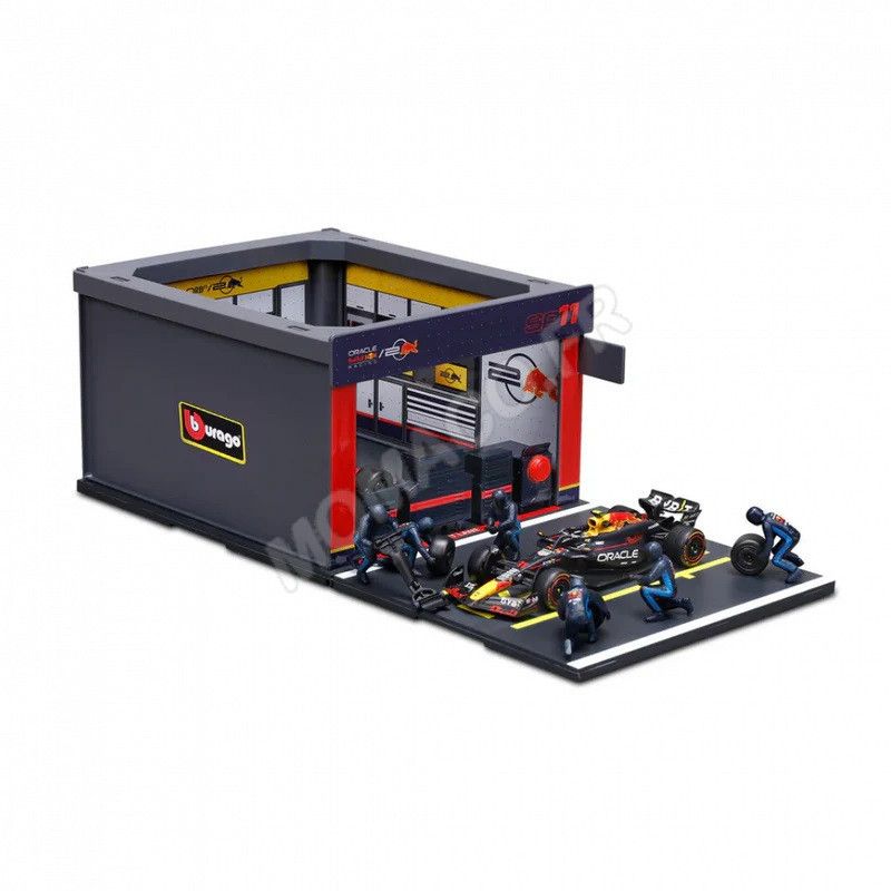 SET PIT STOP : FIGURINES MECANICIENS AVEC STAND ET ACCESSOIRES RED BULL PEREZ