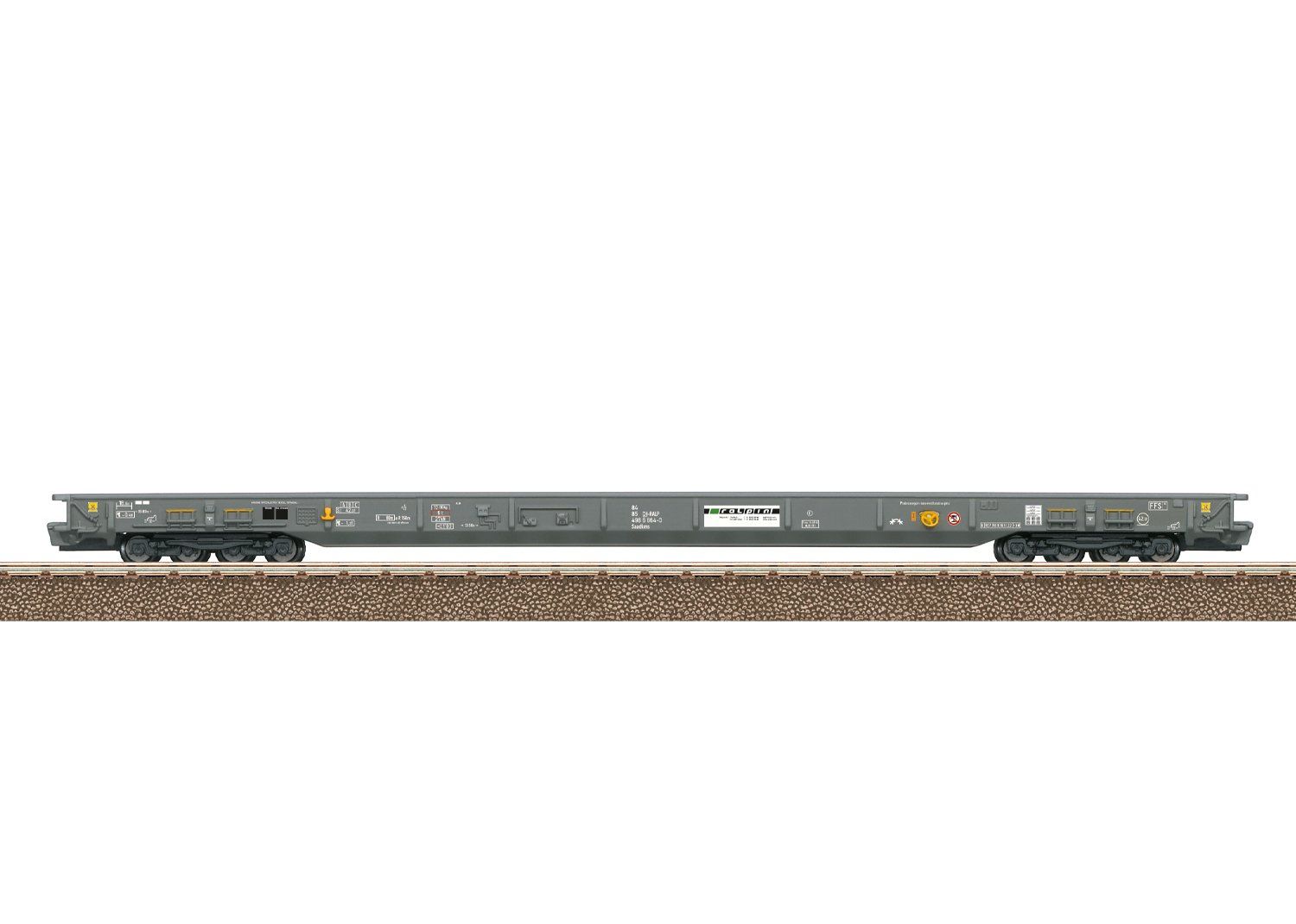 Modèle : Wagons de transport à plancher bas de type Saadkm de RAlpin AG (Olten), destinés au trafic de transit sur la « Route roulante ». Couleur de base gris quartz. Conditions de fonctionnement depuis 2018.